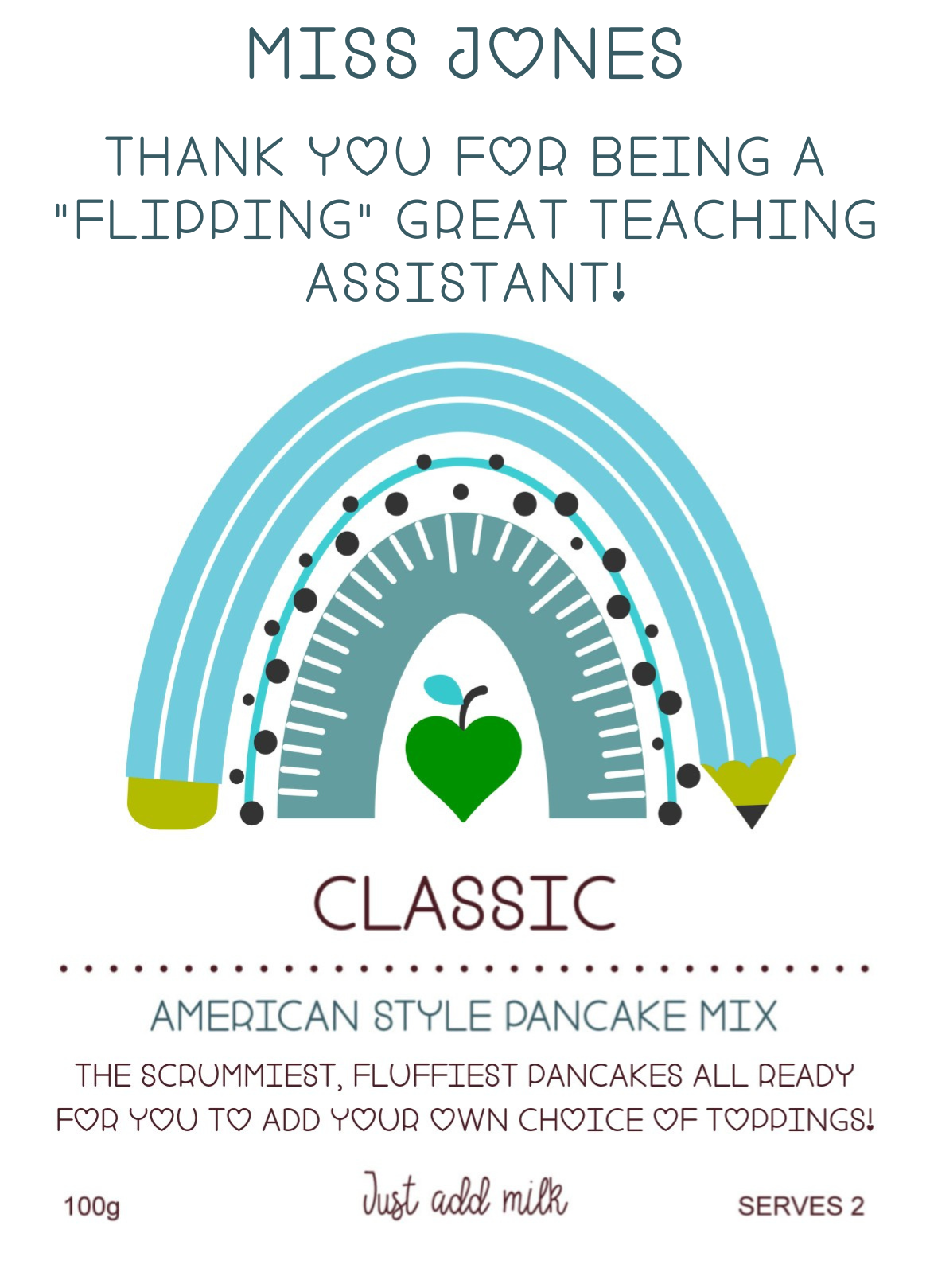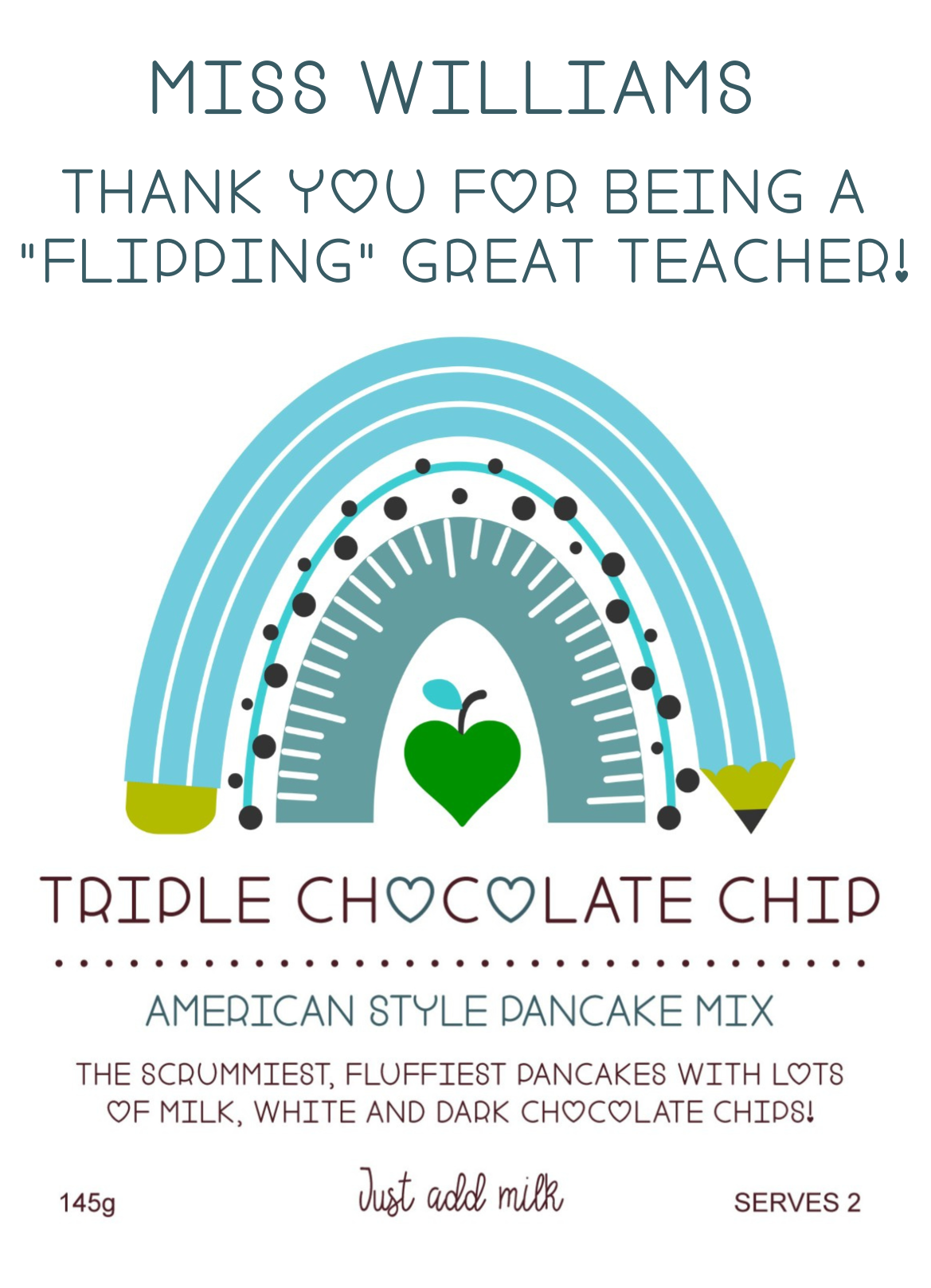 A Personalised Pancake Mix – Choose from Classic American or indulgent Triple Chocolate Chip, with either Teacher or Teaching Assistant label